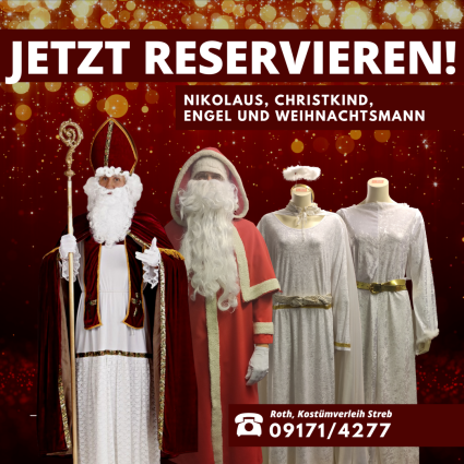 Die Weihnachtszeit steht vor der Tür – und beim Kostümverleih Streb in Roth findest du alles, was du brauchst. Ob Weihnachtsmann-Kostüm, Engel-Outfit oder Christkind-Kleid – wir verleihen hochwertige, gepflegte Kostüme, die jede Feier, Firmenveranstaltung oder Nikolausaktion zum echten Highlight machen. Unsere Weihnachtsmann-Kostüme sind detailreich ausgestattet – mit rotem Mantel, Bart, Mütze und Sack – und lassen dich im Handumdrehen zur beliebten Figur der Adventszeit werden. Wir bieten zudem Engelskostüme mit Flügeln, sowie Christkind-Kostüme. Egal, ob du ein Kostüm für Schulen, Kindergärten, Weihnachtsmärkte, Theateraufführungen oder private Feiern suchst – bei uns wirst du fündig.
